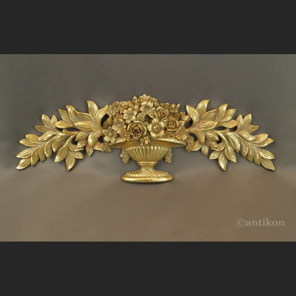 Nadproże w barokowym stylu, przedstawiające kosz obfitości wypełniony kwiatami, otoczony piękną wicią roślinną. Misternie wykonane zdobienia kwiatowe wprowadzają pałacowy przepych, a zarazem subtelną lekkość. Dekoracja wykonana z trwałej masy alabastrowej, starannie złocona w odcieniu platynowego, jasnego złota, bardzo ładny chłodny kolor. Z tyłu znajduje się praktyczna zawieszka. Stan nowy.