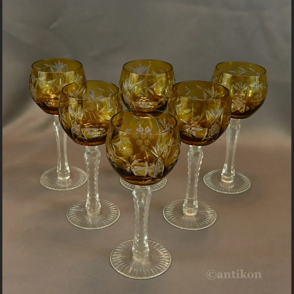 Wysokie, ciężkie kielichy ze szkła kryształowego. Czasze w kolorze miodowo - bursztynowym są piękne. Ozdobione głębokimi szlifami prezentują się wspaniale i uświetnią nie jedną uroczystość.