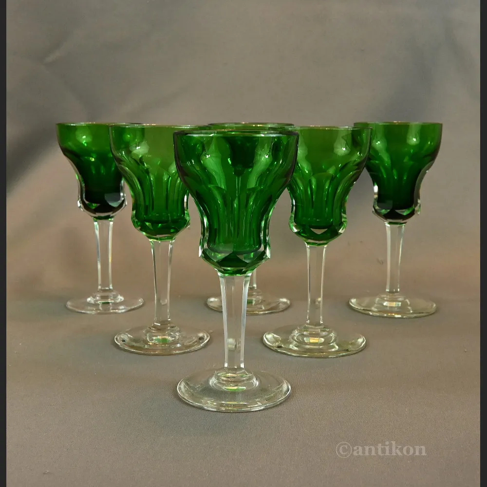 Przepiękny secesyjny zestaw składający się z sześciu secesyjnych kieliszków w kolorze ciemnej zieleni. Kieliszki są wysokie na pięknie profilowanej nóżce osadzona jest podłużna zielona wyraźnie rozszerzająca się ku górze czasza .przenikająca czasza kielicha.