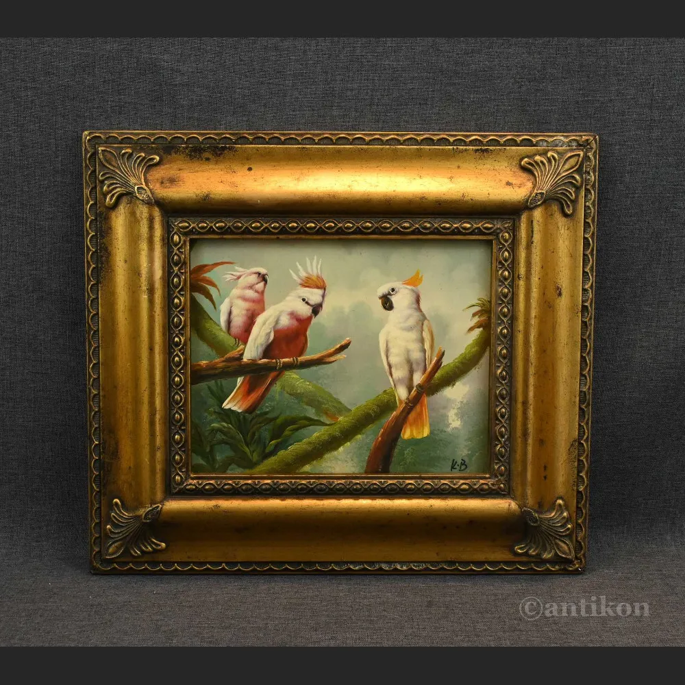 Obraz z ptakami malarstwo olejne na prezent to wyjątkowe dzieło. Obraz olejny namalowany na desce. Oprawiony ramę w kolorze starego złota, ozdobioną aplikami. Technika malarska bardzo dobra. Podpisany inicjałami malarza. Jego unikalność wynika także z kontrastu między żywymi kolorami papug a złotą ramą, która podkreśla jego elegancję i prestiż.