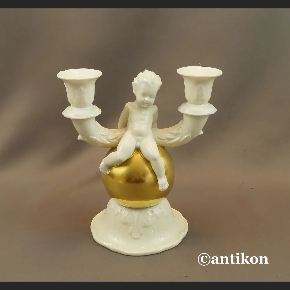 Ten świecznik to wyjątkowy okaz z mlecznej pięknej porcelany z wielką złotą kulą w środku. Ozdobiony jest delikatną figurką putta, ma dwa lichtarze w klasycznym kształcie ozdobione reliefem roślinnym. Polecamy dla romantyków i ludzi ceniących sobie piękna bawarska porcelanę.
