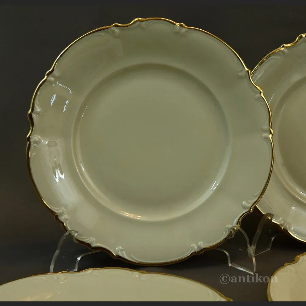 Piękne gładkie talerze do deseru mogą stanowić komplet do serwowania ciasta na uroczystym podwieczorku. Komplet talerzyków deserowych bez wzoru może stanowić uzupełnienie większego serwisu w kolorze kości słoniowej. Bogate złocenie brzegów jest w bardzo dobrym stanie .