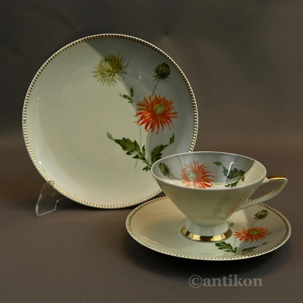 Naczynia są sygnowane na spodzie znak używany w latach 1945-1950 przez fabrykę porcelany Winterling Roslau Bavaria. Zestaw wykonano delikatnej, pięknej porcelany. Dobry stan zachowania, przetarcia złoceń.