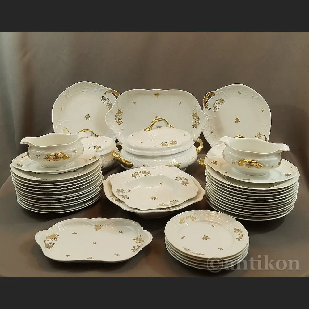 Znakomity serwis obiadowy dla 12 osób. Najwyższej jakości biała porcelana wykonana przez fabrykę Rosenthal w ok. 1930 roku. Ekskluzywny model Sanssouci charakteryzujący się reliefowymi zdobieniami w stylu rokoko i zdobieniami złotymi różami. Wszystkie talerzyki mają także regularnie pofalowane brzegi wykończone ornamentem perełkowym, ozdobione są złotymi różami. Naczynia dekorowane na uszkach i uchwytach satynowanwym złotem, które to doskonale podkreśla piękno tego modelu porcelany.