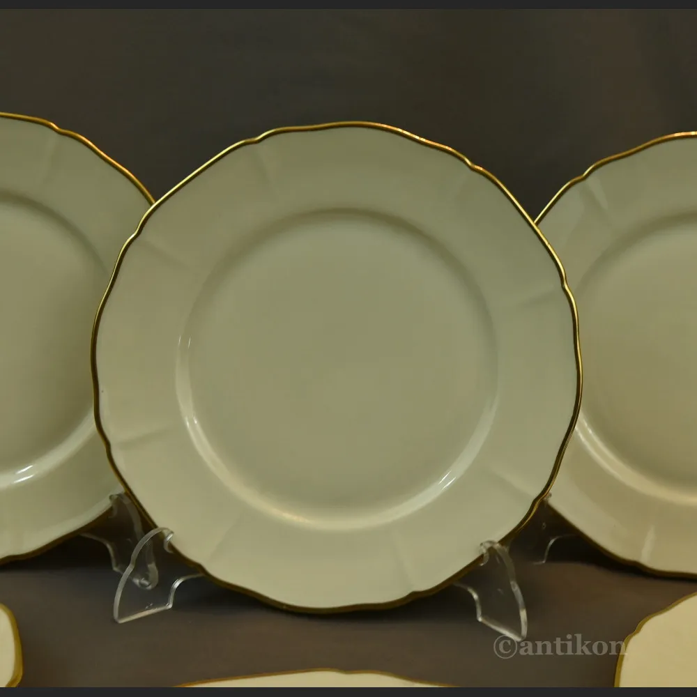 Często w dużych zabytkowych serwisach brakuje talerzy. Mamy to świetne gładkie talerze do deseru mogą stanowić komplet do serwowania ciasta na uroczystym podwieczorku. Komplet talerzy deserowych bez wzoru może stanowić uzupełnienie większego serwisu w kolorze kości słoniowej. Bogate złocenie brzegów jest w bardzo dobrym stanie.