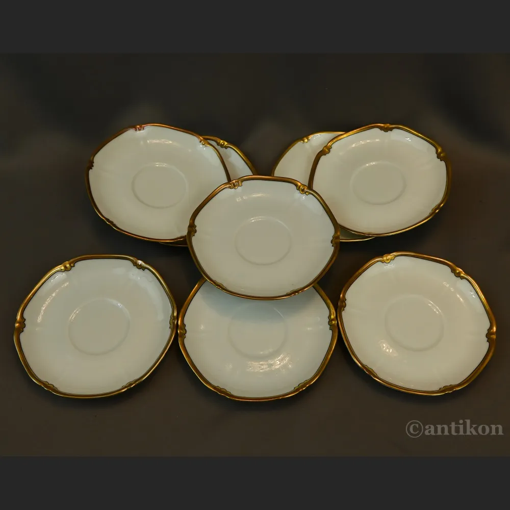 Twój serwis nie jest kompletny? Brakuje talerzy podstawek. Świetne białe talerze z grubym złotym rantem i czarną obwódką Pompadour jak w Rosenthal. Bogate złocenie brzegów jest w dobrym stanie.