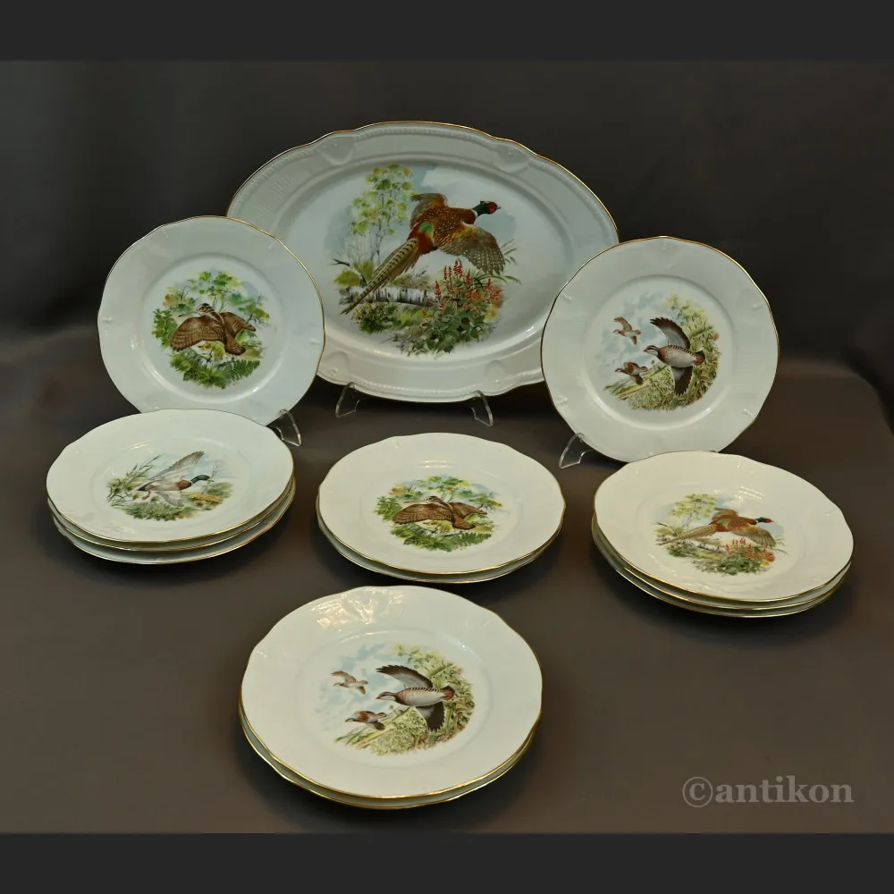 Wspaniały serwis myśliwski z ptakami Limoges to stary zestaw obiadowy do serwowania dziczyzny. Serwis składa się z 12 dużych talerzy obiadowych, oraz bardzo dużego półmiska. Naczynia są ozdobione wizerunkami dzikich ptaków. Talerze po 3 szt z każdego wzoru.
