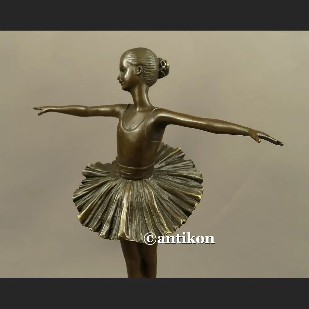 Wspaniała figurka z brązu baletnica Degas w stylu Art Deco. Postać eterycznej tancerki zdaje się płynąć na czubkach palców. Młodziutka dziewczyna w baletowej pozie, stojąc na pointach, zachwyca elegancją i świeżą energią.