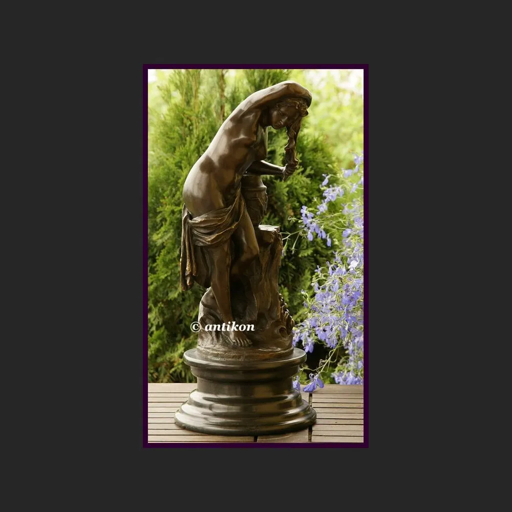 Wspaniały ogromny akt dziewczyny rzeźba z brązu prawdziwego, osadzona na walcowatym marmurowym postumencie. Przedstawia niezwykle piękny akt dziewczyny o zgrabnej figurze. Młoda kobieta została uchwycona w trakcie mycia swych ślicznych długich włosów.