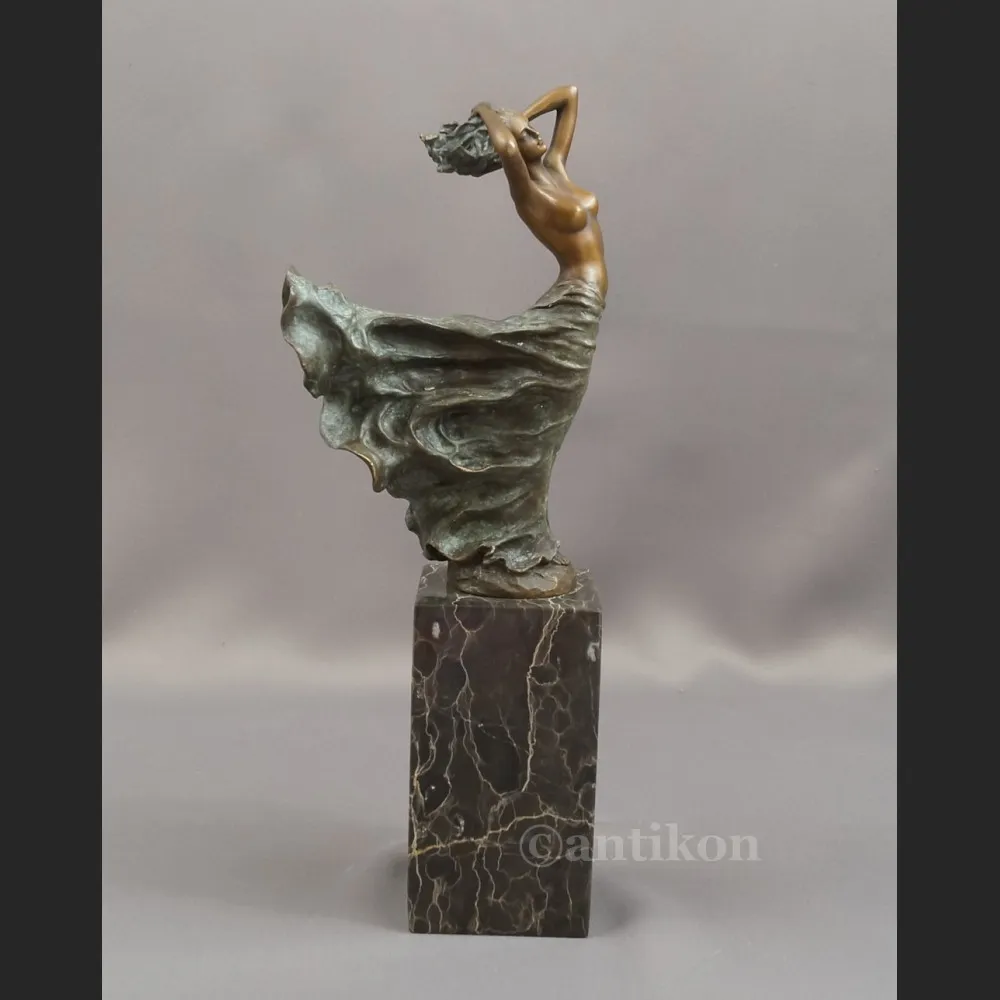 Znakomita rzeźba z prawdziwego brązu w stylu secesyjnym. Przedstawia półnagą młodą kobietę w pełnej gracji, zmysłowej pozie. Urodziwa dziewczyna ma niezwykle powabne ciało okryte jedynie długą spódnicą, której fałdy zdają się powiewać na wietrze, przez co statuetka nabiera dynamicznego charakteru. Figura osadzona jest na prostopadłościennym cokole z żyłkowatego marmuru.