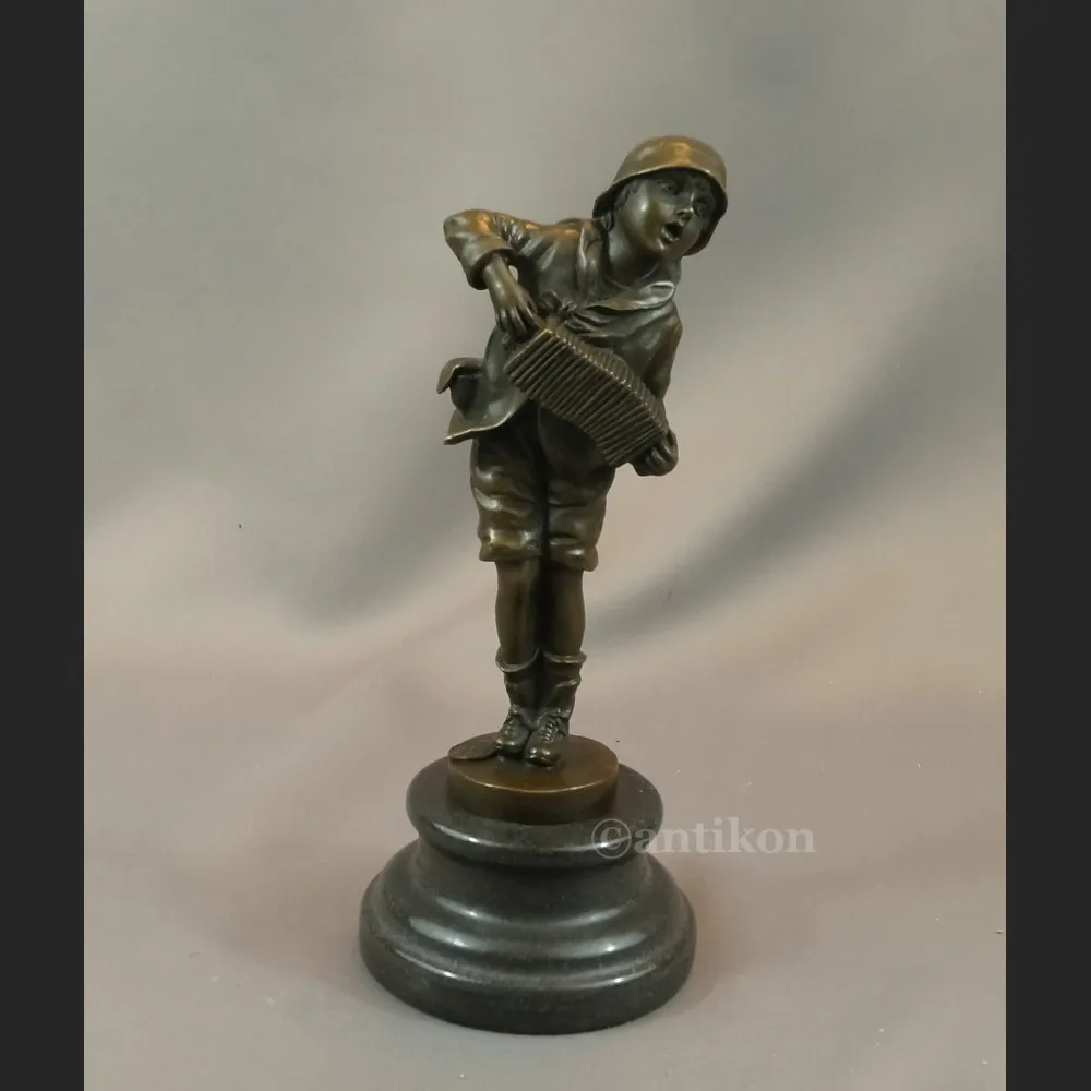 Przepiękna figurka z brązu chłopiec grający na harmonii w stylu Art Deco. Ukazuje chłopca, który śpiewa i gra na harmonii. Zachwycająco oddano detale zatrzymanej w ruchu postaci, układ fałd trochę zbyt obszernego ubranka oraz rozczulającą twarzyczkę dziecka. Wywinięta kieszeń marynarki nadaje postaci łobuzerskiego uroku.