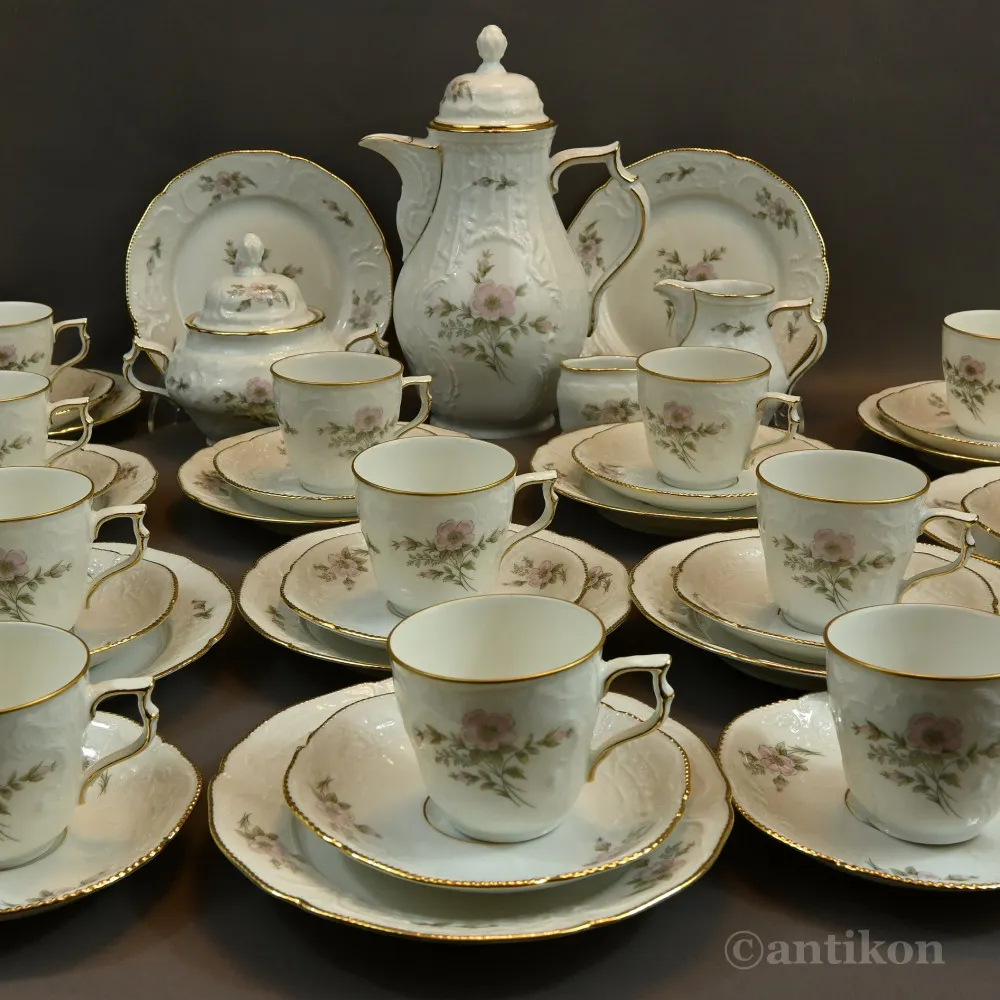 Zachwycający serwis do kawy lub herbaty na 12 osób na duży stół. Wykonany w słynnej fabryce porcelany Rosenthal. Sygnatura z lat 1957-1967.