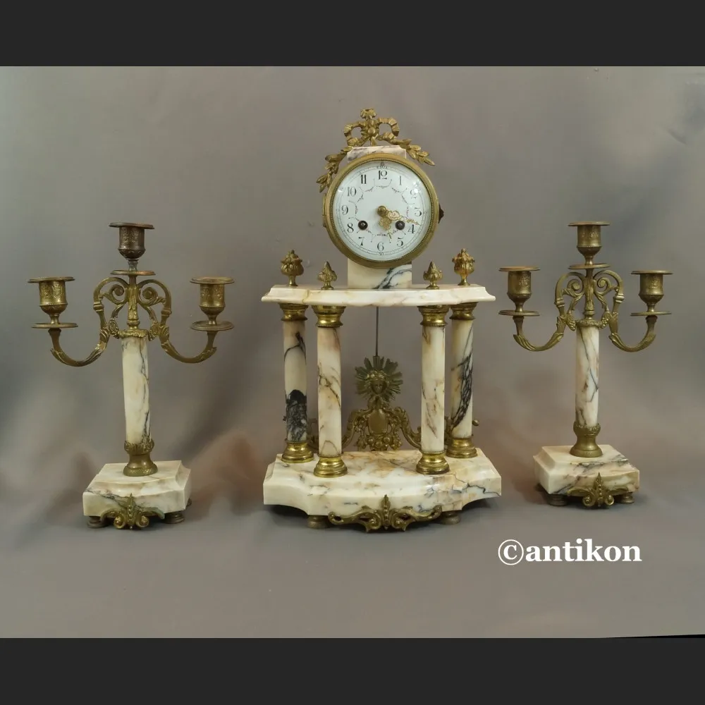 Zegar kominkowy antyk wykonany jest z jasnego żyłkowanego marmuru, wsparty na dwóch kolumnach. Zegar dekorują aplikacje ze złoconego brązu. Zarówno oprawa zegara jak i przystawki są bogato zdobione kwiatowymi motywami. Wszystkie trzy części kompletu mają po cztery nóżki. Tarcza porcelanowa jest ozdobiona malowaną kwiatową girlandą. Na tarczy z wyraźnymi arabskimi cyframi umieszczone są wskazania minut i godzin. Tarczę osłaniają przeszklone wypukłe drzwiczki. Zegar nakręcany jest kluczykiem, który oczywiście dołączamy do przedmiotu. Zegar wybija półgodziny i godziny. Wahadło słońce dołączone do zegara. Mechanizm sygnowany wybitą pieczęcią z napisem Samuel Marti Medaille d"Or Paris 1900 oraz numerami. Świeczniki trójramienne. Całość jest bardzo ciężka.