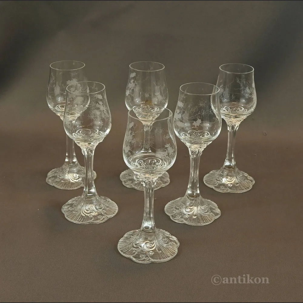 Kieliszki oczarowują finezyjnie wytłoczonymi nóżkami o roślinnym wzorze i trawionej w winogronowe wzory czaszy. Relief dodaje kieliszkom romantycznego charakteru. Zestaw wykonano z wysokogatunkowego szkła w fabryce Rosenthal. Sygnowane Rosenthal.