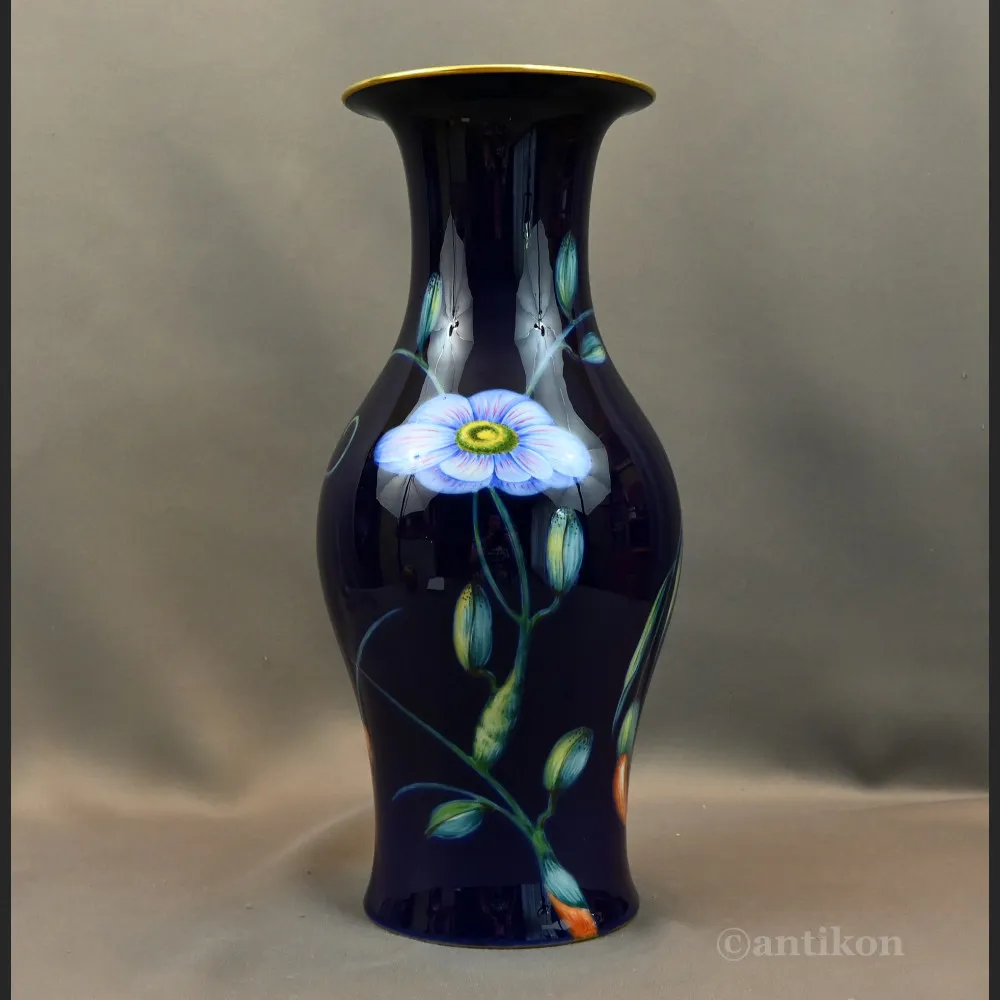 Przedwojenny wazon Rosenthal antyk to wyjątkowy przykład luksusowej porcelany z lat 30 XX wieku. Wysoki, okazały wazon o ciemnogranatowym tle zachwyca elegancją i precyzją wykonania. Powierzchnię zdobią ręcznie malowane, delikatne gałązki kwiatowe, które subtelnie kontrastują z głębokim kolorem porcelany.