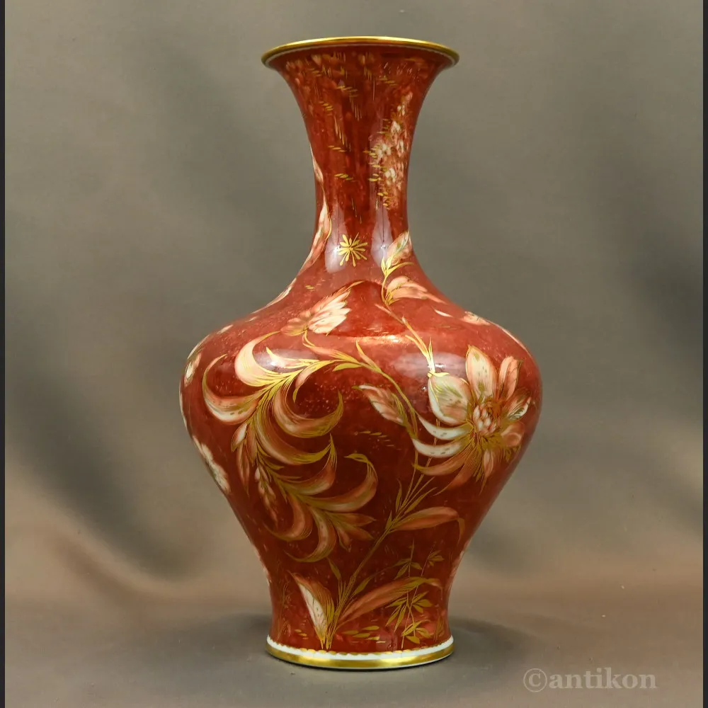 Przedmiotem oferty jest imponujący, klasyczny wazon Rosenthal o głębokim, ceglasto-miedzianym kolorze. Pokryty ręcznie malowanymi, złoconymi motywami kwiatowymi, stanowi wyjątkowy przykład kunsztu niemieckiej porcelany artystycznej.